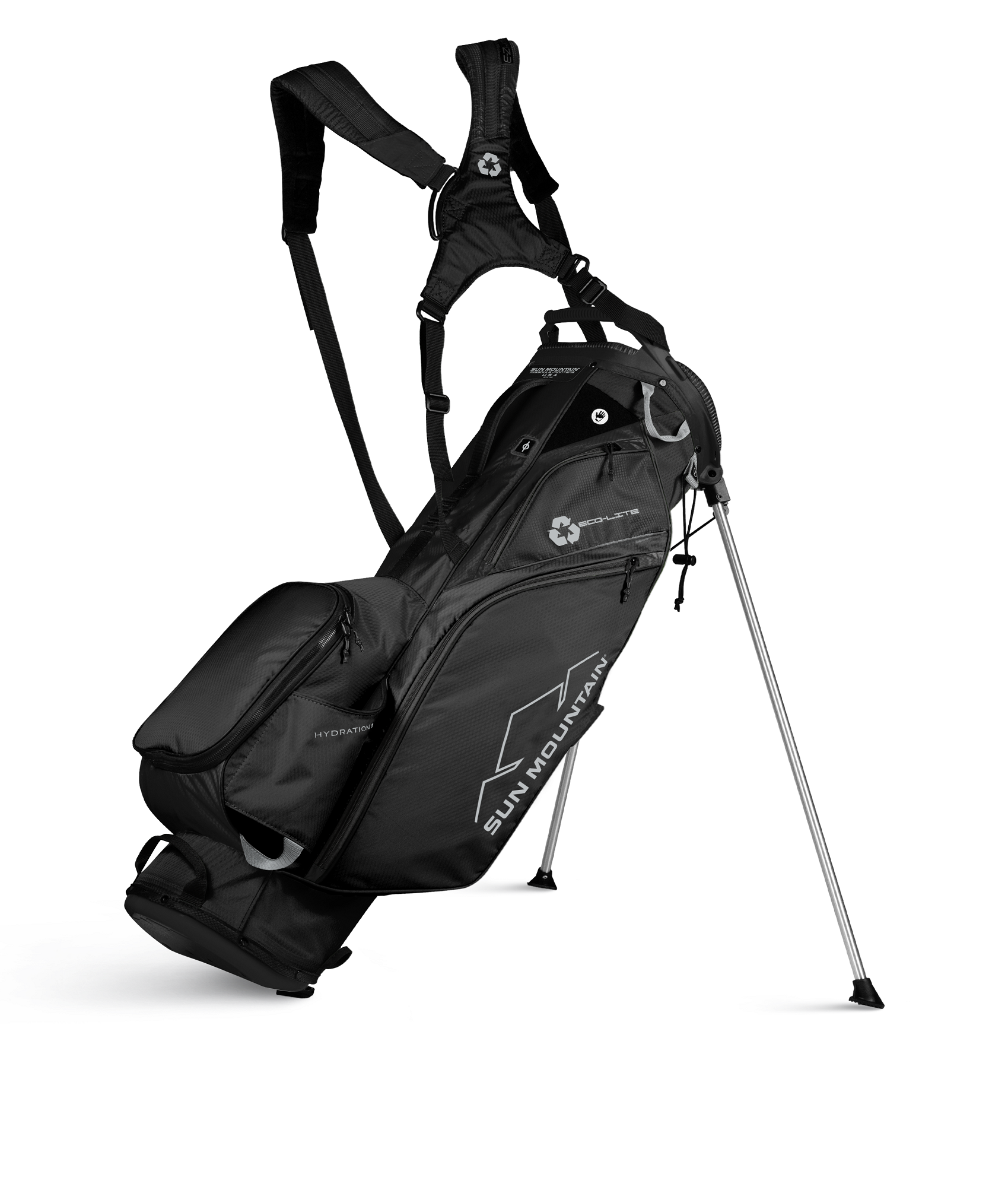 The Repreve® fabric used in the Eco-Lite is made using recycled plastic bottles. Approximately twenty-five 20-oz bottles go into the material used in each bag. On top of which, Eco-Lite has many of the great features offered in Sun Mountain’s top-selling stand bags. It has 5 pockets, a roomy 9” top and weighs under four pounds.