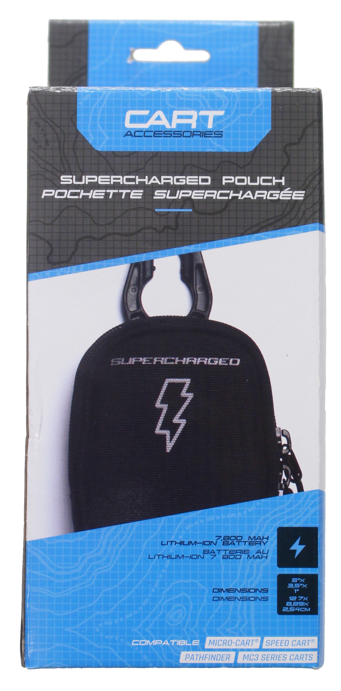 The Supercharged Pouch is a velour-lined pouch that attaches to your cart with an accessory knob. It comes complete with a Philips Power Bank 7800 mAh Lithium Ion Battery which will recharge your phone or other electronic devices or power your portable music speaker.